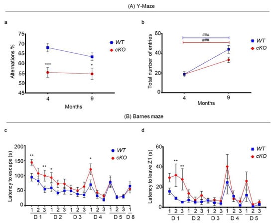 Short- and long-term memory assessment. (A) Y-maze for WT (n = 20) and cKO (n = 18) mice. (a) Alternation (%) at the ages of 4 and 9 months. (b) Total number of entries at the ages of 4 and 9 months. (B) Barnes maze for WT (n = 15) and cKO (n = 15) mice. (c) The time taken to find the escape chamber, measured 3 times per day for 5 consecutive days. On day 8, one single test session was performed to assess long-term memory. (d) Time taken to leave departure zone (Z1), measured 3 times per day for 5 consecutive days. Statistical significance between cKO and WT mice at different time points is represented as: * p ≤ 0.05, ** p ≤ 0.01, *** p ≤ 0.001. Statistical significance with time in cKO or WT mice is represented as: ### p ≤ 0.001.