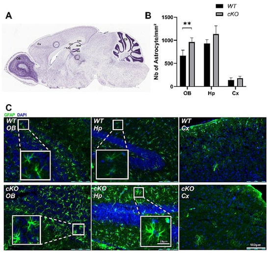 The olfactory bulb (OB), hippocampal (Hp), and cortical (Cx) regions were identified on the sagittal sections according to the mouse brain atlas (Figure 7A). For the quantification of gliosis, glial fibrillary acidic protein (GFAP)-stained areas showing obvious shapes of a cell body were considered as GFAP+ cells. We counted all GFAP+ cells in the whole field of images using three sagittal images per animal, taken from the OB, Hp, or Cx, and compared the results obtained for cKO (n = 5) and WT mice (n = 5). We observed a significant increase in the number GFAP+ cells in the OB of cKO compared to WT mice (962 ± 40 and 669 ± 52 GFAP+ cells, respectively, p = 0.0079). No statistically significant differences were found in the Hp (WT mice: 928 ± 38; cKO mice: 1135 ± 79; p = 0.09) or the Cx (WT mice: 141 ± 20; cKO mice: 180 ± 17; p = 0.3) (Figure 7B). This increase in GFAP + cells can be seen in the immunohistochemical panel corresponding to the OB of the cKO mice (Figure 7C). In addition, the staining intensity and shape of the cells were different between the cKO and WT sections of the OB. The cells appeared bigger and more ramified in cKO mice. The number of branches were quantified, and the results showed a significant increase in cKO mice (7.3 ± 0.33) compared to WT (4.25 ± 0.17, p < 0.001) (Supplementary Figure S10). Moreover, GFAP+ cells in cKO mice exhibited larger cell bodies and cytoplasmic extensions in both the OB and the Hp. No major changes were noticed in the Cx. Similar images were observed in the Hp even when the total number of GFAP+ cells was unchanged. Altogether, our findings suggest astroglial activation in cKO mice.
