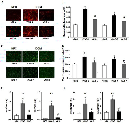 Increased cardiomyocyte hypertrophy and myocardial fibrosis are prominent features of adverse myocardial remodelling. Histological characteristics of VAD, NVAD and NFC hearts were analysed, with representative images shown in Figure 1. Fibrosis was increased in both the LV and RV of NVAD DCM hearts, at levels approximately 2-fold and 1.5-fold, respectively. Upon LVAD implantation, fibrosis was decreased in the VAD group compared to the NVAD group (Figure 1A,B). Similarly, cardiomyocyte cross-sectional area (CSA) was significantly larger in the LV and RV of NVAD DCM hearts (p < 0.05). Upon LVAD implantation, cardiomyocyte CSA was decreased in the VAD group compared to the NVAD group (Figure 1C,D). The cardiac enlargement was also confirmed in the NVAD by significantly up-regulated mRNA levels of the hypertrophic markers brain natriuretic peptide (BNP) and β-myosin heavy chain (β-MHC) compared to NFC. However, the levels of these biomarkers were reduced in VAD compared to NVAD (Figure 1E,F).