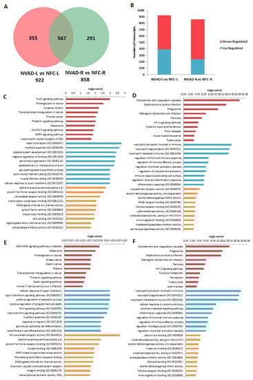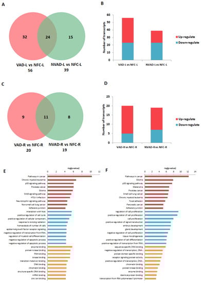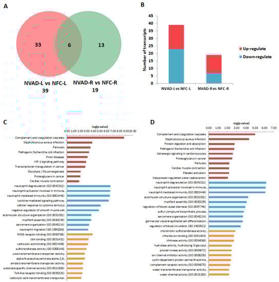 mRNA analysis of dilated cardiomyopathy (DCM) hearts without left ventricle assist device (NVAD) versus non-failing controls (NFC). (A) Number of significant differentially expressed transcripts in the left (L) and right (R) ventricles. (B) Number of significantly up- and down-regulated transcripts in the L and R ventricles. Gene ontology (GO) analysis for (C,E) up-regulated and (D,F) down-regulated differentially expressed genes in the (C,D) L and (E,F) R ventricles. The top ten Kyoto Encyclopedia of Genes and Genomes (KEGG) pathways (red), GO terms for biological processes (blue) and GO terms for molecular functions are shown (yellow).