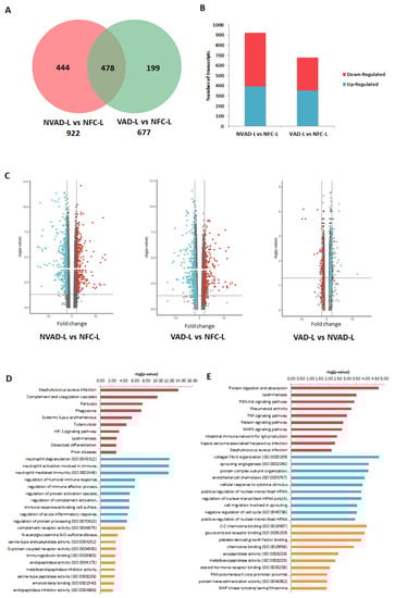 mRNA analysis of left ventricles (LV) from dilated cardiomyopathy (DCM) hearts with (VAD) and without left ventricle assist device (NVAD), using the non-failing controls (NFC) as reference. (A) Number of significant differentially expressed transcripts in the VAD and NVAD groups. (B) Number of significantly up- and down-regulated transcripts in the VAD and NVAD groups. (C) Volcano plots of microarray data from the VAD and NVAD groups. The LV DCM signature genes are marked (red: up-regulated, blue: down-regulated in NVAD group); grey vertical lines indicate two-fold fold-change values in either direction. Gene ontology (GO) analysis for (D) normalized genes in the LV following LVAD use and (E) additional differentially expressed LV genes following LVAD use. The top ten Kyoto Encyclopedia of Genes and Genomes (KEGG) pathways (red), GO terms for biological processes (blue) and GO terms for molecular functions are shown (yellow).