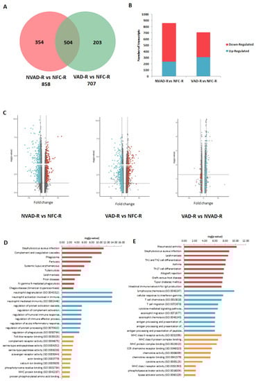 mRNA analysis of right ventricles (RV) from dilated cardiomyopathy (DCM) hearts with (VAD) and without left ventricle assist device (NVAD), using the non-failing controls (NFC) as reference. (A) Number of significant differentially expressed transcripts in the VAD and NVAD groups. (B) Number of significantly up- and down-regulated transcripts in the VAD and NVAD groups. (C) Volcano plots of microarray data from the VAD and NVAD groups. The RV DCM signature genes are marked (red: up-regulated, blue: down-regulated in NVAD group); grey vertical lines indicate two-fold fold-change values in either direction. Gene ontology (GO) analysis for (D) normalized genes in the RV following LVAD use and (E) additional differentially expressed RV genes following LVAD use. The top ten Kyoto Encyclopedia of Genes and Genomes (KEGG) pathways (red), GO terms for biological processes (blue) and GO terms for molecular functions are shown (yellow).