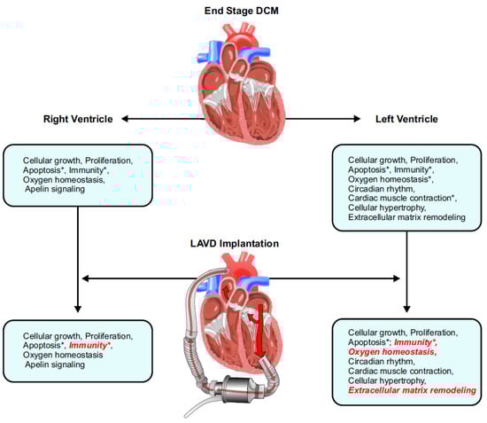 Summary of the findings from this study illustrating the seminal impact of LVAD therapy on reverse remodelling in the left ventricle and right ventricle. Processes that were normalized are italicized in red, and an asterisk (*) indicates pathways where the concerned genes also had corresponding changes at the miRNA level. DCM, dilated cardiomyopathy; LVAD, left ventricular assist device.