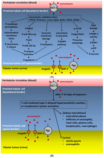 Glomerular filtration excretes vancomycin with 80–90% non-metabolized form into the lumen of the proximal tubule, followed by minimal reabsorption and metabolism by proximal tubular cells [21,22]. On the other hand, vancomycin is also actively transported from the peritubular circulation into proximal tubule cells by the organic cation transporter (OCT)-2, which is located at the basolateral membrane of the tubular cell, and then secreted into the tubular lumen from the apical membrane of the proximal tubule by an efflux transporter, P-glycoprotein [23,24]. Subsequently, vancomycin is transported from the tubular lumen into the tubular cells across the apical membrane by apical endocytosis through dehydropeptidase (DHP)-1 and megalin. In addition, the vancomycin-mediated inhibition of the expression and function of P-glycoprotein also promotes vancomycin accumulation in the tubular cells. The high vancomycin concentration at the brush border is supporting evidence for the ongoing secretion to the lumen, or the reabsorption from the lumen of vancomycin at the apical membrane. In brief, vancomycin enters the tubular epithelial cells via receptor-mediated endocytosis from the urine, and via transporter-mediated secretion from the peritubular circulation [25]. Both pathways cause the drug to accumulate in the tubular epithelial cells’ cytoplasm and expose the tubular cells and the surrounding interstitium to potentially nephrotoxic substances [26]. Hongjing et al. [20] demonstrated that a high dose of vancomycin administration resulted in the induction of many drug transporters of proximal tubular cells in an animal model. These drug transporters include those located in the basolateral membrane (e.g., organic anion transporter (OAT)-1, OAT-3, OCT-2) and those located at the apical membrane (breast cancer resistance protein (BCRP), multidrug and toxin extrusion protein (MATE)-1, MATE-2k, multidrug resistance protein (MRP)-2, and MRP-4) [20]. The association between the alternation of kidney transporters and the kinetic process of VA-AKI has not been fully clarified, but it has crucial clinical implications necessitating further evaluation [20].