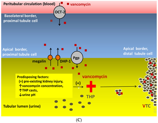 A hypothesis underscores the importance of an initial insult that creates de novo or accentuates pre-existing kidney injury. This insult subsequently causes THP casts, the increased local concentration and precipitation of vancomycin, and the localized necrosis of tubular epithelial cells [14]. An increasing body of evidence indicates that VTCs have a nephrotoxic effect superimposing on and independent from the ATN or AIN in the pathogenesis of VA-AKI. Thus, VTC is considered to be a new mechanism of VA-AKI and a characteristic morphologic profile facilitating the biopsy diagnosis of VA-AKI [14,27]. (Figure 1C).