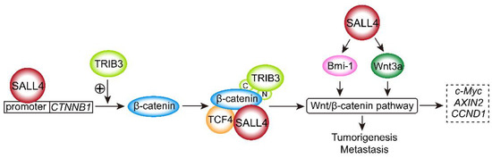 The SALL4A and SALL4B isoforms have been found to bind to the β-catenin protein in SALL4B transgenic mice, and the interactions of these factors activate the Wnt/β-catenin pathway synergistically, which plays essential roles in controlling leukemia stem cell (LSC) self-renewal [33,34,35,36,37]. Downregulation of SALL4 contributed to a decrease in B-cell-specific Moloney murine leukemia virus integration site 1 (Bmi-1) expression and inactivated the Wnt3a/β-catenin signaling pathway in intrahepatic cholangiocarcinoma (ICC) [38]. SALL4 expression was positively correlated with lymph node metastasis and tumor–node–metastasis (TNM) stages in colorectal cancer, and β-catenin was expressed markedly higher in colorectal cancer than in normal tissue [39]. Patients with colorectal cancer with coexpression of SALL4 and β-catenin showed advanced lymph node metastasis and TNM stage. Colocalization of SALL4 and β-catenin was also found in the nucleus and cytoplasm [39]. These findings indicated that the interaction of SALL4 with β-catenin plays crucial functional roles in promoting lymph node metastasis and advanced clinical stage. Another study found that SALL4 modulated the stemness of esophageal squamous cell carcinoma (ESCC) via the Wnt/β-catenin signaling pathway and epithelial–mesenchymal transition (EMT). SALL4 promotes intrahepatic cholangiocarcinoma cell proliferation by activating Wnt/β-catenin signaling [19]. The regulation of Wnt/β-catenin signaling pathway by SALL4 is shown in Figure 1.