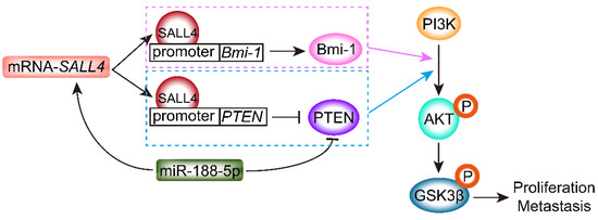 SALL4 regulates tumor proliferation and metastasis through inhibition of PTEN expression and activation of the PI3K/AKT signaling pathway. SALL4 can simultaneously bind to the promoter regions of Bmi-1 and PTEN, leading to increased Bmi-1 expression and decreased PTEN expression, and then activates PI3K/AKT/GSK3β signal pathway. Additionally, miR-188-5p inhibits the expression of PTEN and increases SALL4 transcription.
