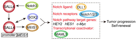 SALL4 activates the Notch signaling pathway. Co-overexpression of SOX2 and SALL4 results in tumor progression and cancer cells self-renewal via activation of the Notch signaling pathway through elevating the expression of main four types of signaling molecules, including Notch ligand DLL1; receptors Notch1/2/3; Notch pathway target genes HEY2, HES1, and c-Myc; and transcriptional coactivator MAML1. Upregulation of Notch3 also increases the expression of SALL4. Moreover, SALL4 induces MEIS1 expression by binding to its promoter, then alters the function of Notch signaling pathway.