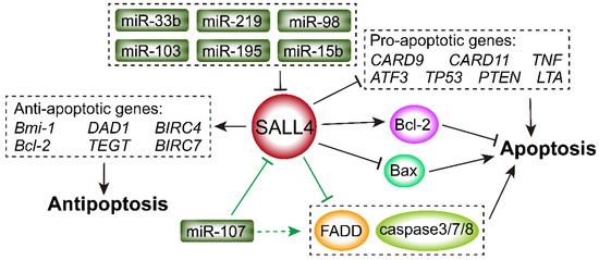SALL4 regulates Bcl-2, Bax, caspase-related pathway, and death-receptor pathway. MiRNAs (miR-33b, miR-219, miR-98, miR-103, miR-195, miR-15b, and miR-107) suppress SALL4 expression. MiR-107 induces cell apoptosis by directly targeting SALL4, resulting in the increased expression of FADD and the activation of caspase-8 and caspases-3/7. SALL4 contributes to cell survival by suppression of apoptotic genes such as Bax, CARD9/11, TNF, ATF3, TP53, PTEN, and LTA, as well as activation of anti-apoptotic genes including Bmi-1, DAD1, BIRC4, Bcl-2, TEGT, and BIRC7.