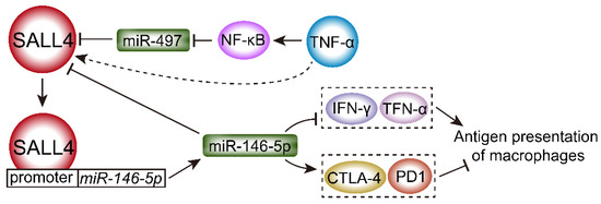 Additionally, SALL4 promotes the expression of miR-146a-5p by binding its promoter, while silencing SALL4 inhibits the expression of inhibitory receptors and reverses T-cell exhaustion (Figure 5). HCC cell-secreted miR-146a-5p can be delivered by exosomes into macrophages, switch the cytokine profile, and attenuate antigen presentation of macrophages through inhibiting the expression of IFN-γ and TNF-α and upregulating the expression of inhibitory receptors such as programmed death ligand 1 (PD-1) and cytotoxic-T-lymphocyte-antigen-4 (CTLA-4), promoting the production of alternatively activated M2-polarized tumor-associated macrophages [87] (Figure 5).