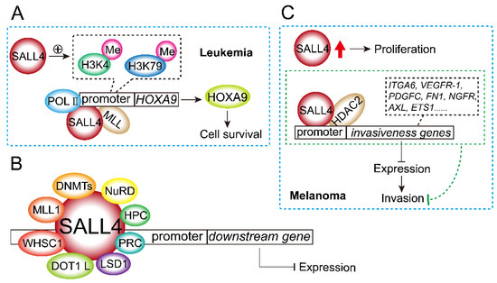 SALL4 regulates gene expression through epigenetic mechanisms. As shown in Figure 6A, SALL4 has been found to interact with histone methyltransferase mixed lineage leukemia (MLL) and co-occupy the homeobox A9 (HOXA9) promoter region with MLL. Moreover, overexpression of SALL4 enhances markers of histone activation, such as H3K4 and H3K79 methylation, as well as RNA polymerase II (POLII) binding in the same promoter region, which increases HOXA9 expression in AML. The data demonstrated that the SALL4/MLL/HOXA9 pathway was a crucial regulator of leukemic cell survival [92]. In addition, SALL4 interacts directly with DNA methyltransferases (DNMTs), indicating that SALL4 can inhibit transcription by recruiting DNA methyltransferases [93]. SALL4 also interacted with histone lysine-specific demethylase 1 (LSD1) to inhibit gene transcription in stem cells [94]. Furthermore, SALL4 co-occupies target genes with the polycomb repressive complex (PRC), indicating that SALL4 may inhibit gene transcription by inducing PRC components such as Bmi-1 or by interacting with PRC members, including RNF2, PhcI, EZH2, EED, SUZ12, and RbAp46/48, as well as HPC proteins [6,95].