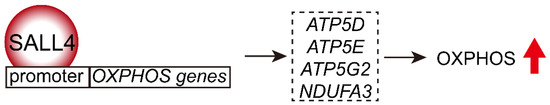A recent study found that SALL4 induced mitochondrial oxidative phosphorylation (OXPHOS) during tumorigenesis [118] (Figure 7). A phenomenon commonly called the Warburg effect usually occurs in during tumorigenesis [119]. Cancer cells usually rewire their bioenergetic metabolism by changing from mitochondrial OXPHOS to aerobic glycolysis, despite the presence of oxygen. SALL4-positive cells resist this common trend in HCC cell metabolism by driving mitochondrial OXPHOS instead. SALL4 induction of OXPHOS and mitochondrial ATP leads to the allosteric suppression of basal glycolysis rates [118]. Thus, SALL4-positive cancer cells possess a latent capacity for the Warburg effect, but this latent capacity is suppressed in the steady state. Additionally, SALL4 overexpression increases the transcription of mitochondrial OXPHOS genes, and SALL4 silencing leads to downregulation of OXPHOS genes, such as ATP5D, ATP5E, ATP5G2, and NDUFA3, as well as a functional reduction in mitochondrial oxygen consumption and OXPHOS [118] (Figure 7).