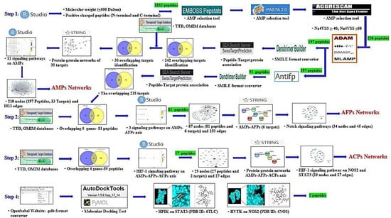 In our study, network pharmacology-based analysis was utilized to investigate triple therapeutic feasibility (AMPs―AFPs―ACPs’ axis) of SCPs. Firstly, SCPs (N- and C-terminal cationic groups; ≤500 Dalton) were selected via RStudio analysis. Commonly, N-terminal cationic groups contribute to the stabilization of the helical structure and C-terminal cationic groups can induce transduction into the cell membrane []. It implies that N- and C-terminal cationic groups are significant residues to penetrate the cell membrane. Secondly, the physicochemical propensity of selected SCPs was identified via AMPs’ screening platform, and a hub signaling pathway of AMPs between AMPs-related targets and host-responsive targets was analyzed. Thirdly, the AFPs’ screening platform was used to find AFPs from selected AMPs, and a hub signaling pathway of the AMPs―AFPs’ axis was identified between AFPs-related targets and host-responsive targets. Fourthly, the AMPs―AFPs―ACPs axis was constructed by retrieving cancer-related targets from public databases. Fifthly, SCPs accepted by the AMPs―AFPs―ACPs’ axis and targets on a hub signaling pathway were subjected to perform MDS. Finally, we found (via network pharmacology) a hub signaling of SCPs, which might be assumed to strengthen the host defense system. The workflow diagram is depicted in Figure 1.