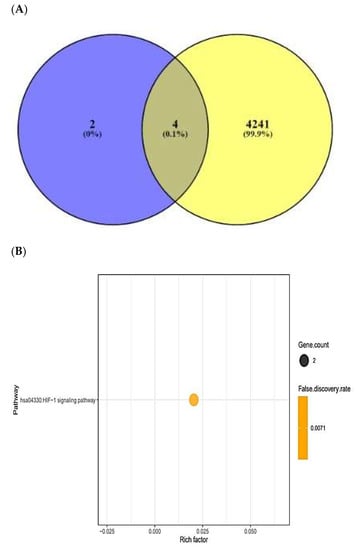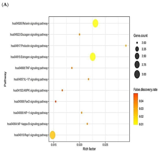 The final overlapping targets’ (bacterial-responsive targets on humans) networks were visualized by STRING (https://string-db.org/) (Accessed on 21 June 2021) []. A bubble chart of the Kyoto Encyclopedia of Genes and Genomes (KEGG) pathway based on the final overlapping targets was constructed by RStudio.