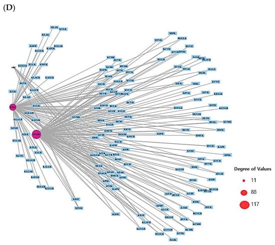 The 13 out of the overlapping 30 targets were notably enriched in 11 signaling pathways via KEGG pathway enrichment analysis (Figure 3A). The targets of the 11 signaling pathways were enlisted (Table 2). The 13 targets were associated with the number of 197 peptides, and the constructed peptide–targets’ networks identified 210 nodes and 1011 edges (Figure 3B). The peptide–targets’ network analysis via the overlapping 30 targets was constructed by STRING, which indicated 30 nodes and 68 edges (Figure 3C). Among 11 signaling pathways, inactivation of Rap1 signaling pathway was identified as a hub signaling pathway through a bubble chart. Among 11 signaling pathways, the Rap1 signaling pathway’s targets were SRC, FPR1, and ITGB1, which were constructed with 158 nodes (3 targets, 155 peptides) and 216 edges on a size map (Figure 3D). Among the three targets (SRC, FPR1, and ITGB1), ITGB1 connected to 117 peptides was the highest degree of value. It implies that ITGB1 plays a vital role in Rap1 signaling pathways in human defense systems against bacterial infection.