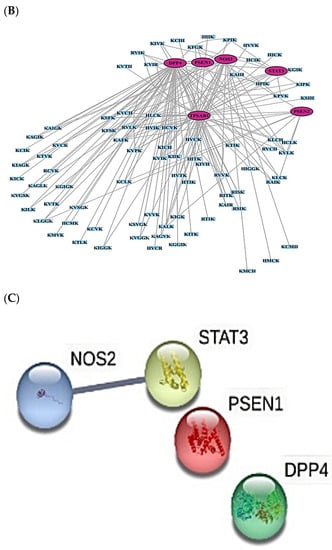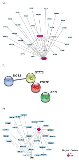 The number of 91 peptides’ sequences was converted to SMILE format via Dendrimer Builder (https://dendrimerbuilder.gdb.tools/) (Accessed on 21 May 2021). The SMILE format of peptide was input to SEA (http://sea.bkslab.org/) (Accessed on 24 May 2021) and STP (http://www.swisstargetprediction.ch/) (Accessed on 26 May 2021) with “Homo Sapiens” setting. The numbers of 357 and 330 targets were identified from SEA and STP, respectively (Supplementary Table S8). Figure 4A displays that the number of 218 overlapping targets was selected from the two databases. (Supplementary Table S9). The number of six overlapping targets (TPSAB1, PSEN1, PSEN2, DPP4, STAT3, and NOS2) was identified between the number of AFPs’ targets (245 targets from the TTD and OMIM databases) (Figure 4B), (Supplementary Table S10) and the overlapping 218 targets.