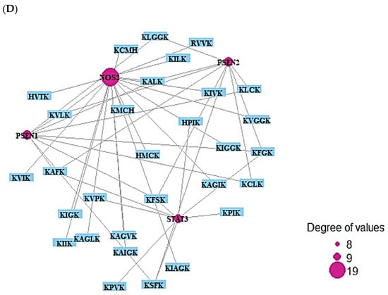 The six targets (TPSAB1, PSEN1, PSEN2, DPP4, STAT3, and NOS2) were connected to three signaling pathways via KEGG pathway enrichment analysis (Figure 5A). Table 3 shows the targets of the three signaling pathways. The six targets (TPSAB1, PSEN1, PSEN2, DPP4, STAT3, and NOS2) were related to the number of 81 peptides (Supplementary Table S11). The constructed network exposed 87 nodes (81 peptides, 6 targets) and 1011 edges (Figure 5B). The peptide–targets’ networking analysis via overlapping six targets (TPSAB1, PSEN1, PSEN2, DPP4, STAT3, and NOS2) was constructed by STRING, indicating six nodes and two edges (Figure 5C). Among three signaling pathways, activation of Notch signaling pathway was identified as a hub signaling pathway through a bubble chart. Notch signaling pathway’s targets were both PSEN1 and PSEN2, and their peptides–targets’ network was constructed on a size map (34 nodes and 45 edges) (Figure 5D). Among the four targets, PSEN1 and PSEN2 were connected to nine peptides (KLCK, KCLK, KALK, KVLK, KLGGK, KAFK, KFGK, KFSK, and KSFK), which might have more efficacy than any other AFPs. Additionally, it implies that both PSEN1 and PSEN2 play a pivotal role in the Notch signaling pathway of the human defense system against fungal infection on the AMPs―AFPs’ axis.
