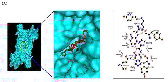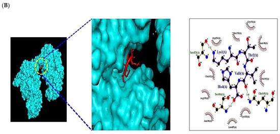 The final peptides were docked on target proteins, processing autodock4 by setting up four energy ranges and eight exhaustiveness ranges as defaults to obtain 10 different poses of ligand molecules []. The 2D binding interactions were constructed through LigPlot+ v.2.2 (https://www.ebi.ac.uk/thornton-srv/software/LigPlus/) (Accessed on 30 June 2021) [].