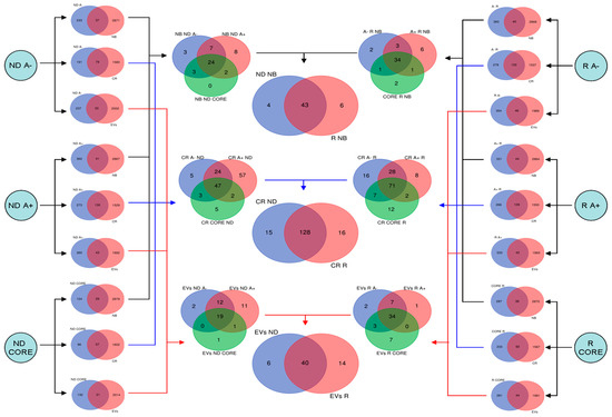 According to the workflow in Figure 1, comparing the lists of elements resulting from the LC-ESI-MS/MS analysis with the sub-proteome class of “Extracellular Vesicles proteins” (EVs) available in the Human Protein Atlas [5], 33 elements in A− ND, 43 in A+ ND, 21 in CORE ND, 46 in A− R, 42 in A+ R and 44 in CORE R resulted as EVs proteins. Grouping all the EVs ND-GBM proteins found, avoiding the redundant elements, resulted in 46 unique elements. The Venn diagram in Figure 12A shows their distribution within the diverse zones. The same analysis was performed for the EVs R-GBM proteins, resulting in 54 unique elements (Figure 12B).