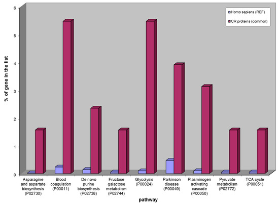 Over-represented pathways of 128 CR proteins common to Newly Diagnosed and Recurrent GBMs. From the left: asparagine and aspartate biosynthesis, blood coagulation, de novo purine biosynthesis, fructose galactose metabolism, glycolysis, Parkinson disease, plasminogen activating cascade, pyruvate metabolism, TCA cycle.