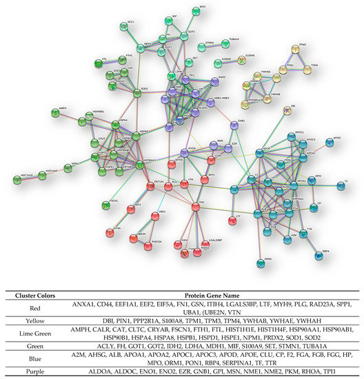 The bioinformatics data elaboration of the protein–protein interactions relative to the 128 proteins common to ND- and R-GBMs by STRING tool [10] showed, with highest confidence, a dense network of interactions with the disconnected nodes hidden, evidencing six clusters (Figure 11).