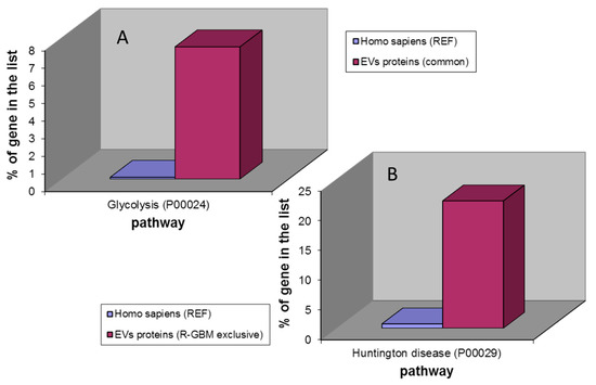 Finally, considering the total proteins identified in ND and R-GBM pools and classified in NB, CR and EVs sub-proteomes, a particular focus was due to the proteins that were in common between the ND-GBM A− zone and R-GBM tumor zone, to disclose protein elements possibly correlated to the onset of tumor relapse occurring at the same site of the primary tumor.