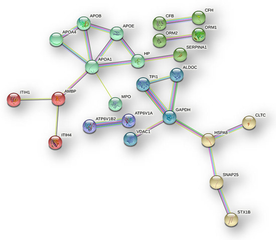 The further analysis of the 43 NB proteins common to ND- and R-GBM pools (Figure 3) for investigating the functional interactions by STRING bioinformatics tool [10] showed, in highest confidence, a dense network of interactions (Figure 6) and evidenced six clusters, hiding the disconnected nodes.