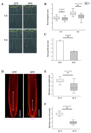 To examine the impact of heat stress on primary root growth, we transferred 5-day-old wild-type Arabidopsis thaliana (Col-0) seedlings germinated and grown on normal 1/2 MS medium at 22 °C to 30 °C to grow continually. After 3- and 4-day treatment, we measured the elongation of newly grown primary roots and found the length was significantly shorter at 30 °C compared with 22 °C (Figure 1A,B). Similarly, the growth rate was also slower at 30 °C (Figure 1C). To assess the effect of high temperature in detail, we further examined the root meristem under both temperatures. Consistent with the change in root elongation, plants growing at 30 °C showed an evident reduction in the meristem size and cell number (Figure 1D–F).