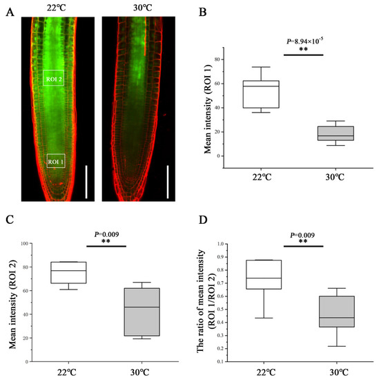 Heat stress inhibits phloem unloading in the root tips. (A) Comparison of the phloem unloading in the root of pSUC2::GFP-expressing 5-day-old seedlings at 48 h after being transferred to 22 °C and 30 °C. Scale bars = 100 μm. (B) Quantification of fluorescence intensity in an area of 50 × 40 µm2 (ROI1, 50 µm away from quiescent center (QC) in the central root meristem). (C) Quantification of fluorescence intensity in an area of 50 × 40 µm2 (ROI2, 300 µm away from QC in the stele). (D) Quantification the unloading capability from the phloem into the meristem by the ratio of GFP fluorescence intensity of an ROI1 relative to an ROI2. In the box plots (B–D), the boxes indicate the first and third quartiles, and the whiskers indicate the minimum and maximum values. The black lines within the boxes indicate the median values. ** p < 0.01 (two-tailed, two-sample t-test).