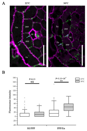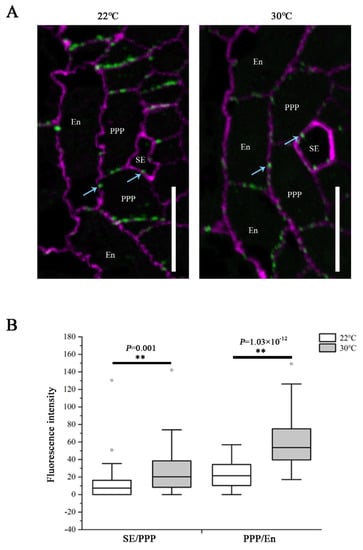 It is known that PD-mediated symplastic movement regulates phloem unloading in the root, and the callose turnover controls the plasmodesmal permeability [13,16,20]. To determine the influence of heat on PD conductivity, callose levels at PD were assessed by immunolocalization using a callose antibody on root sections derived from the unloading domain. We examined the plasmodesmal callose signals at both the SE–PPP and PPP–endodermal interfaces. The root tips of Col-0 seedlings transferred to 30 °C for 24 h showed a significant increase in callose amount at both interfaces, compared with that growing at 22 °C (Figure 3). These results indicate that the restriction of GFP unloading into the root meristem in response to heat stress resulted from excessive callose deposition at PD within the unloading zone, and this overproduction affected both the SE and post-SE unloading.