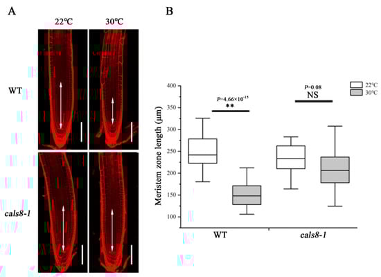 Loss of CalS8 rescues the decrease in meristem size under heat stress. (A) Five-day-old roots of WT and cals8-1 were transferred to 22 °C and 30 °C for 48 h and stained with propidium iodide to visualize the cell walls. Double arrows indicate the meristem zone. Scale bars = 100 μm. (B) Quantification of the meristem length in A, n > 20. In the box plots, the boxes indicate the first and third quartiles, and the whiskers indicate the minimum and maximum values. The black lines within the boxes indicate the median values. ** p < 0.01 (two-tailed, two-sample t-test). NS, not significant.