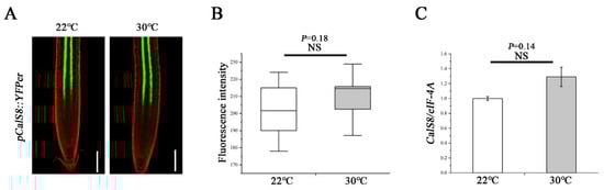 To explore how the heat regulates the CalS8 function, we further tested whether the heat-induced callose deposition was accompanied by an elevated level of CalS8 gene transcription. We first treated the transgenic plants harboring the CalS8pro::YFPer construct at 30 °C for 24 h. No significant difference in YFP reporter activity was observed at 30 °C and normal 22 °C (Figure 6A,B). We next verified this result by reverse transcription quantitative PCR (RT-qPCR). The expression level of CalS8 were also hardly affected by heat stress (Figure 6C). Taken together, these data suggest that the callose induction at PD in response to the heat stress is not due to transcriptional activation of the CalS8 gene. It remains to be tested whether this callose response is a result of post-transcriptional modification or activity promotion at the protein/enzyme level.