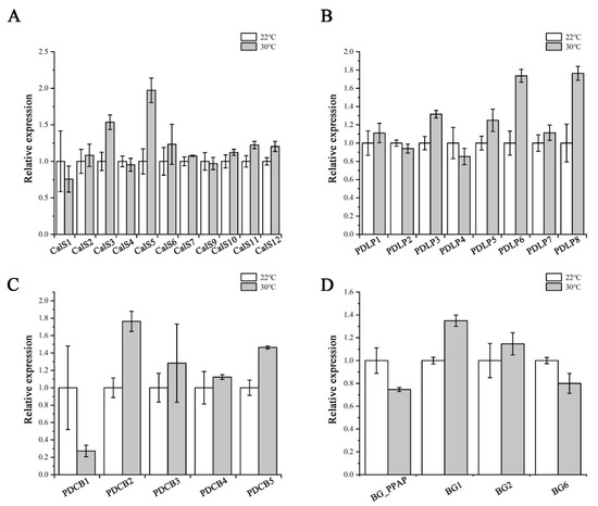 Callose levels are regulated by the opposing activities of two enzyme families: callose synthases and β-1,3-glucanases, which produce and break down callose, respectively [21]. PDLPs and PDCBs are two key proteins families that positively regulate callose accumulation at PD [25,26]. We next used RT-qPCR to confirm the expression of PD callose associated genes, including the remaining eleven CalSs, four β-1,3-glucanases (BG_PPAP, BG1, BG2, BG6), eight PDLPs, and five PDCBs. As shown in Figure 7, no dramatic and significant upregulation in their expression levels was detected after heat treatment. This suggests that the heat stress probably does not interfere with callose biosynthesis via regulating most of the associated genes at the transcriptional level.