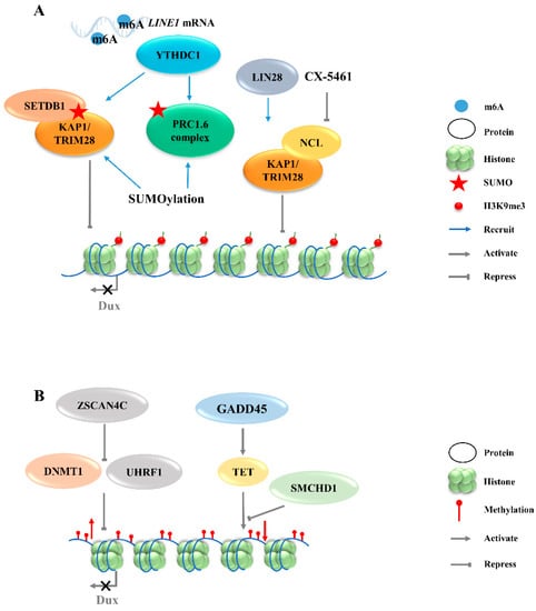 The totipotent 2CLCs have also been reported to exhibit increased histone modifications in H3K27ac, H3K4me1, and H3K4me3, as compared with ESCs [38]. Although these histone modifications are associated with transcriptional activation, no evidence exists to show that Dux expression will be directly regulated by these modifications. The downregulations of chromatin modifiers such as LSD1 and chromatin assembly factor 1 (CAF-1) facilitate MERVL activation [15,39]. Furthermore, MERVL requires lysine (K)-specific demethylase 1A (KDM1A, also as LSD1)—a histone lysine-specific demethylase, a KRAP-associated transcriptional repressor (KAP1), and G9A—a H3K9 histone methyltransferase—for epigenetic repression in normal mESCs [27,40,41]. Likewise, there is no direct evidence showing that the expression of Dux can be regulated by these chromatin modifiers. Recently, LIN28, an RNA-binding protein, was identified as able to repress Dux by an epigenetic program (Figure 2A). H3K9me3 levels were decreased at Dux and its downstream targets, and thus de-repressed Dux expression in Lin28 knockout cells [11]. However, the mechanisms underlying how Lin28 regulates H3K9me3 remain elusive. It is worth noting that Lin28a depletion releases Dux repression by reducing the occupancy of Nucleolin/tripartite motif-containing protein 28 (NCL/TRIM28) in the Dux region. TRIM28 is also known as KAP1, which was demonstrated to repress Dux expression in a long interspersed nuclear element-1 (LINE1)-dependent manner in mESCs [27,42]. LINE1 are Class I transposable elements, which can repress Dux expression by interacting with NCL and KAP1 in mESCs [42]. Mechanistically, after LINE1 RNA is methylated by METTLE3, the m6A-modified LINE1 RNA then works as a scaffold recognized by the YTH domain containing 1 (YTHDC1), which further recruits H3K9me3 regulators, including SET domain bifurcated histone lysine methyltransferase 1 (SETDB1) and KAP1, to the locus of Dux, inhibiting its expression [43,44]. Furthermore, polycomb-repressive complexes (PRCs) bind LINE1 RNA and act as an essential partner for Dux gene repression [45]. SUMO modification enhances the H3K9me3 levels on a genome-wide scale, including the Dux locus, and facilitates the recruitment of PRC1.6 and KAP/SETDB1 complexes to the locus to repress Dux gene expression (Figure 2A) [46]. In fact, Ythdc1 depletion results in a global decrease in the SETDB1-mediated H3K9me3 enrichment, which is accompanied by the re-activation of MERVL and Dux [43]. However, Ythdc1-depleted cells still retain the ability to re-activate many retrotransposons upon Dux removal, indicating a parallel regulation pattern between Ythdc1 and Dux with regard to retrotransposon regulation [44]. Due to the sequence differences in LINE1 among species, it is not clear whether LINE1 has similar effects in other mammals, including Homo sapiens [47].