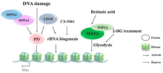 Protein synthesis heterogeneity requires the ribosome to be assembled in a cell-type-specific manner. Thus, differences in ribosome biogenesis can cause specialized mRNA subsets to be translated, which indirectly determine cell identity. Recent studies indicate that the inhibition of rRNA biogenesis can promote the state transition from ESCs to 2CLCs [11,13]. CX-5461, an RNA Pol I inhibitor, can decrease rRNA biogenesis and disrupt the nucleolar integrity and formation of peri-nucleolar heterochromatin (PNH). Upon the disruption of nucleolar integrity, the loss of NCL/TRIM28 complex from PNH causes changes in epigenetic modification, leading to the release of Dux (Figure 4) [13]. Transcription factor LIN28 has been reported to bind to RNAs in the nucleolus, and its loss impeded ribosome assembly and recapitulated CX-5461-induced 2CLCs molecular phenotypes [11]. In addition, rRNA repression will activate p53, an effector of DNA-damage response pathway [34]. Nevertheless, the connection to the mechanism of Dux production by transcriptional regulation and specific pathways observed in Dux activation remains to be elucidated. Meanwhile, how the different signaling pathways cooperate during Dux activation requires further elucidation.