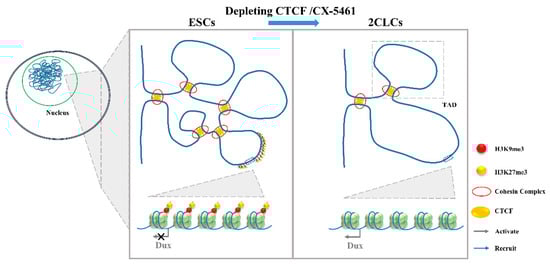 Gene expression regulation is relevant to chromatin structure [64], and Hi-C studies profiling the 3D chromatin structure of the genome could describe the evolutionarily conserved topologically associating domains (TADs) that were correlated with gene expression. Combined with mouse and human models, TADs have been linked to gene regulation. During the mESC to 2CLC transition, a lower TAD strength and TAD insulation have been observed [39]. Consistent with this is the disruption of chromatin organization by the depletion of CCCTC-binding factor (CTCF)/Cohesin or by culturing with CX-5461 upregulate Dux expression and promote a 2-cell-like program [13,14]. It is worth noting that the attenuation of H3K9me3 and H3K27me3 in CX-5461-treated cells is associated with the reinforcement of a repressed chromatin state [65]. The expression of human DUX4, the C-terminal region, which shares a high similarity with mouse DUX, can recruit CBP and P300 to induce local chromatin relaxation, accompanied with a global increase in H3K27 acetylation [66]. These results indicate that epigenetic modification is important for the chromatin state change [67]. Chromatin relaxation facilitates the binding of transcription factors to the Dux locus, which might be the first step required to promote Dux expression [14,39]. The expression of DUX increases the active histone modifications and chromatin accessibility [9], and this positive feedback loop might be required to promote the 2C-like state (Figure 4).