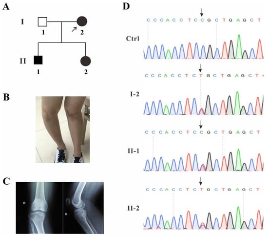 A family with SPS clinical manifestations was recruited from Fujian Province, China, and the blood samples from three patients and one healthy volunteer were collected (Figure 1A). Proband I-2 displayed mild genu valgum and genu recurvatum, which was suspected to be caused by the dislocation of the small patella (Figure 1B). The patient’s right leg was examined by X-ray DR (Digital Radiography). The report showed that the knee joint was abnormal and the patella was displaced laterally (Figure 1C).