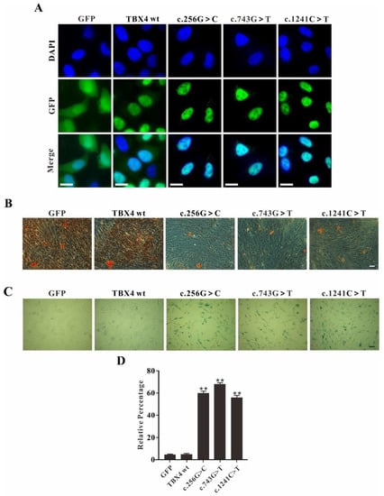 In order to further explore the cellular phenotypes caused from TBX4 mutations, MSCs with stable overexpression of either TBX4wt or TBX4mt were subjected to β-galactosidase staining for cell senescence assay. The results showed that all the three missense mutations overexpressed MSCs exhibited more senescent cells compared to the TBX4wt overexpression MSCs (Figure 3C,D). In GFP alone and TBX4wt transfected cells, less than 10% of the cells were β-galactosidase positive; however, in TBX4mt transfected cells, the positive cells were increased up to 60% (Figure 4E). Our results indicate that all three TBX4 missense mutations result in the reduced activities of osteogenic differentiation and increased senescence of MSCs.