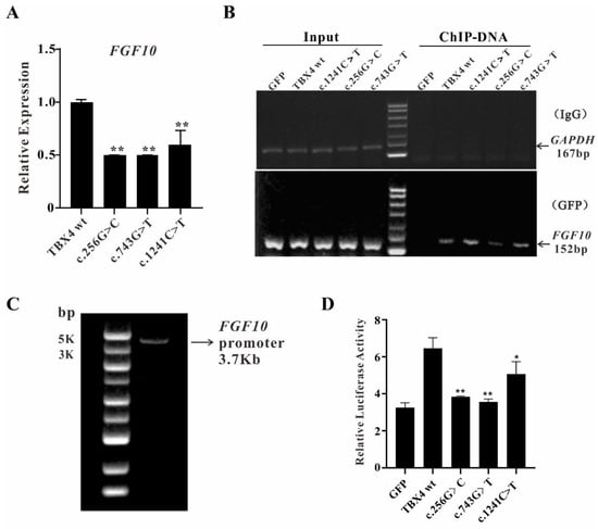 It was known that the TBX4-FGF10 pathway plays a key role in hindlimb development []. Since TBX4 mutations affect cell differentiation and senescence, we are wondering whether the abnormal development of hindlimb is caused by an impaired TBX4-FGF10 pathway []. To test our hypothesis, qRT-PCR was performed to quantify the relative mRNA expression of FGF10 in MSCs with overexpression of either TBX4wt or TBX4mt. The results showed that the expression of FGF10 is significantly decreased in all three missense mutations overexpressed MSCs, indicating that TBX4 wild-type is involved in the initiation or maintenance of FGF10 expression, whereas mutations in TBX4 lead to the reduced FGF10 transcriptional activity (Figure 4A).