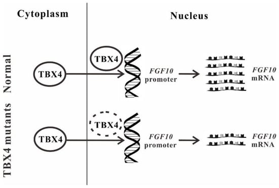 TBX4 is an important transcription factor. In this paper, qRT-PCR confirmed that all three TBX4 mutations affected the expression of FGF10. Dual luciferase reporter assay is widely used for the investigations on gene transcription regulation and promoter transcription activity []. The cDNA of Renilla luciferase (Rluc) involved in the pGL3-TK vector is used as an internal reference to eliminate the differences in cell number or transfection efficiency []. The results demonstrated that TBX4 mutations reduced the expression of FGF10. Considering that FGF10 may be not the unique target gene of TBX4, ChIP-seq will be a powerful tool for exploring more target genes of TBX4 []. Taken together, our study indicates that TBX4 mutations do not alter the translocation of TBX4 into the nucleus and the binding ability with FGF10, but exhibit less efficiencies to initiate the transcription of FGF10 resulting in the abnormal biological processes (Figure 5).