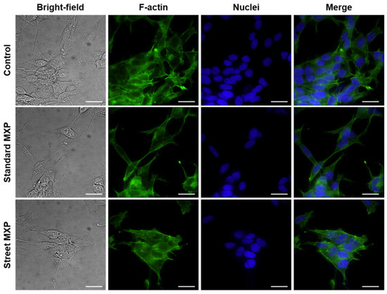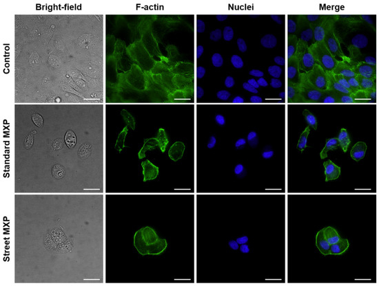 The amount of 1 × 105 of 5637 and SH-SY5Y cells was seeded into 35 mm glass-bottom dishes (#1.5) for live-cell imaging (MatTek, Ashland, MA, USA) and kept to adhere for 16 h. After that, the cells were gently washed twice with prewarmed (37 °C) phosphate-buffered saline (PBS; pH 7.4) which was changed for DMEM supplemented with street and standard MXP sample at the final concentration of 150 and 300 µM for 5637 cells, and 50 and 100 µM for SH-SY5Y cells. The incubation with the evaluated compounds proceeded for 24 h; untreated cells served as controls. After the incubation period, the cells were gently washed with PBS, and then the cells were fixed with a 4% solution of methanol-free formaldehyde (Thermo Fisher, Waltham, MA, USA) in PBS for 20 min in the dark at laboratory temperature. Then the fixative was discarded and the cells were washed twice with PBS and stained with a solution of phalloidin-Atto 488 (Atto-tec, Siegen, Germany) with 4’,6-diamidino-2-phenylindole (DAPI, Sigma-Aldrich, St. Louis, MO, USA) for 15 min. After that, the staining solution was discarded, the cells were washed twice with PBS and subjected to microscopy analysis.