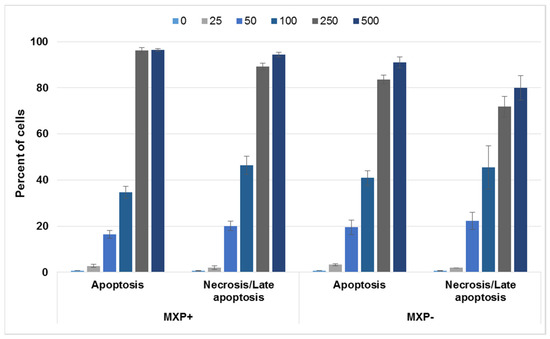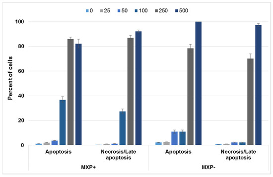 Further, based on the observed pre-apoptotic morphology of cells treated with MXP, we aimed to examine the type of cell death induced by this NPS. For this experiment, again 5637 and SH-SY5Y cell lines were chosen and treated either with MXP containing inorganic impurities or its synthetic standard at 0–500 µM concentrations for 72 h, after which the cells were stained with an apoptosis/necrosis fluorescent kit. The proportion of apoptotic vs. necrotic 5637 and SH-SY5Y cells after this treatment is given in