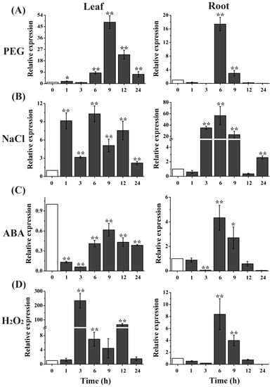 TIPs have been addressed to fulfill functions in plant adaption to various abiotic stresses [23]. To gain insight into the roles of TaTIP4;1 in response to water stress and salinity, changes in its transcript abundances were firstly examined in wheat under stress. Treatment of seedlings with 10% PEG significantly enhanced the transcriptional levels of TaTIP4;1 at 6, 9, 12 and 24 h in leaves and 6 and 9 h in roots. Likewise, 200 mM NaCl led to clear increases in mRNA abundances of TaTIP4;1 at all treatment time points in leaves, and 3, 6, 9 and 24 h in roots (Figure 1A,B). Exogenous 100 μM ABA had evident stimulation effects on TaTIP4;1 expression at 6 and 9 h in roots but had no induced impact in leaves (Figure 1C). Application of 10 mM H2O2 resulted in pronounced enhancements of TaTIP4;1 mRNA levels at 3, 6 and 12 h in leaves and 6 and 9 h in roots (Figure 1D). These results indicate that TaTIP4;1 was markedly induced by drought, salinity, ABA and H2O2. Tissue expression of TaTIP4;1 was also measured. It was found that TaTIP4;1 was strong expressed in roots, stems and leaves (Figure S1).