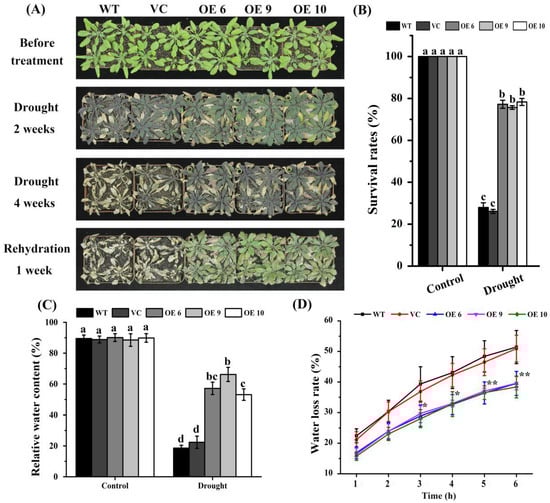 TaTIP4;1 overexpression improved drought tolerance in Arabidopsis. (A) Growth performances of plants. Four-week-old plants of Arabidopsis WT, VC, OE6, OE9 and OE10 were not watered for 2 and 4 weeks, respectively, and then rewatered for 1 week. (B) The survival rates of plants after drought stress for 4 weeks. (C) Relative water contents of leaves after drought stress for 4 weeks. Different lowercase letters show that the values from the plants significantly differed from each other by one way ANOVA and Tukey’s honestly significant difference test (Tukey’s HSD test) (p < 0.05). (D) Leaf water loss rates of four-week-old plants. Single and double asterisk indicate that the values of TaTIP4;1 overexpressors significantly differed from WT and VC plants at * p < 0.05 and ** p < 0.01 levels respectively by student’s t test. Data are mean ± SD (n ≥ 3).