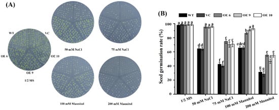 Effects of NaCl and mannitol on seed germination of Arabidopsis TaTIP4;1 overexpressors. (A) Phenotypes of seed germination and seedling growth of various plants. OE6, OE9, OE10, WT and VC were germinated in 1/2 MS medium not containing or containing 50 mM NaCl, 100 mM NaCl, 100 mM mannitol or 200 mM mannitol for 10 day. (B) Seed germination rates of various plants in (A). Data are mean ± SD (n ≥ 3). Different lowercase letters above the error bars reveal the data of various plants significantly differed from each other by one way ANOVA and Tukey’s HSD test (p < 0.05).
