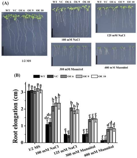 Effects of NaCl and mannitol on primary root growth of Arabidopsis transgenic plants overexpressing TaTIP4;1. (A) Seedling growth performances. Five-day old seedlings of OE6, OE9, OE10, WT and VC were transferred to 1/2 MS medium supplemented without or with 100 mM NaCl, 125 mM NaCl, 300 mM mannitol or 400 mM mannitol, and grown for another 10 days. Scale bars are 1 cm. (B) Increments in the length of primary roots of various lines in (A). Values are mean ± SD (n ≥ 3). Different lowercase letters above the error bars indicate that the values of the lines significantly differed from each other by one way ANOVA and Tukey’s HSD test (p < 0.05).