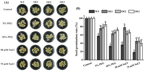 Effects of PEG6000 and NaCl on seed germination of rice WT and TaTIP4;1 overexpressors. (A) Seed germination performances. Seeds of WT, OE1, OE2 and OE3 were germinated in the absence or presence of 5% PEG6000, 10% PEG6000, 50 mM NaCl or 75 mM NaCl for 7 days. (B) Seed germination rates of all lines in (A). Data are mean ± SD (n ≥ 3). Distinct lowercase letters above the error bars show that the data of various plants significantly differed from each other by one way ANOVA and Tukey’s HSD test (p < 0.05).