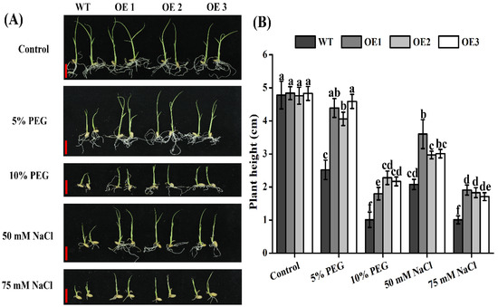 Effects of PEG6000 and salt on the growth of rice WT and transgenic lines. (A) Seedling growth performances. Three-day-old seedlings of WT and transgenic lines grown in liquid 1/2 MS medium were treated without or with 5% PEG6000, 10% PEG6000, 50 mM NaCl or 75 mM NaCl for another one week. Scale bars are 1 cm. (B) Plant height of all plants in (A). Data are mean ± SD (n ≥ 3). Diverse lowercase letters above the error bars represent that the height values of various plants were significantly different from each other by one way ANOVA and Tukey’s HSD test (p < 0.05).