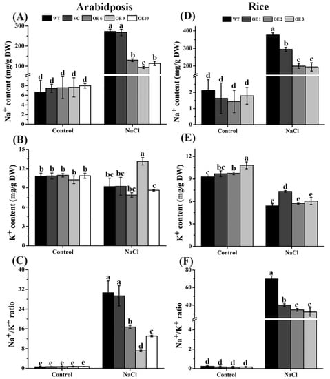 Effects of salt on the accumulation of Na+ and K+ in WT and transgenic plants of Arabidopsis and rice. WT and various OE plants were exposed to NaCl for 2 weeks, and leaves of the plants were collected for measuring the contents of Na+ and K+. (A–C) were Na+ contents, K+ contents and Na+/K+ values in Arabidopsis, respectively; and (D–F) were Na+ contents, K+ contents and Na+/K+ values in rice, respectively. Values are mean ± SD (n ≥ 3). Different lowercase letters above the error bars indicate that the data of various plants significantly differed from each other by one way ANOVA and Tukey’s HSD test (p < 0.05).