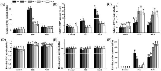 MDA levels reflect the degree of lipid peroxidation in membranes. It was found that MDA contents pronouncedly enhanced in WT and VC rather than in the three OE lines after challenged by 300 mM PEG, and 200 mM NaCl (Figure 8B).